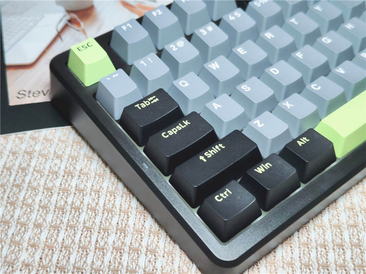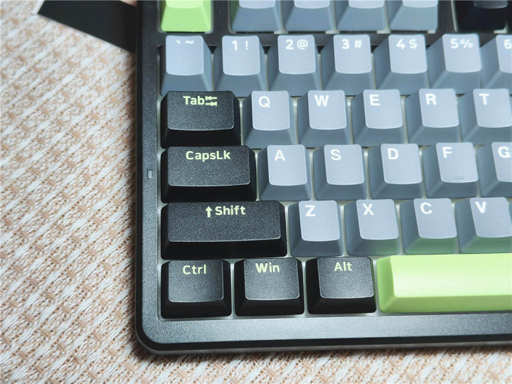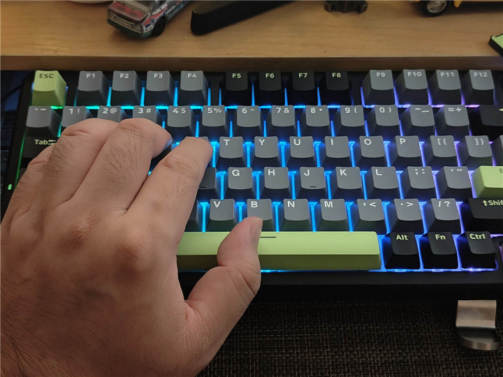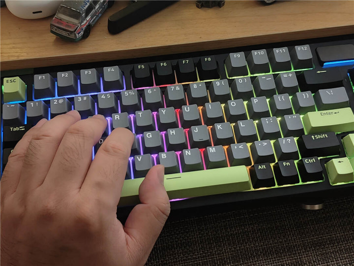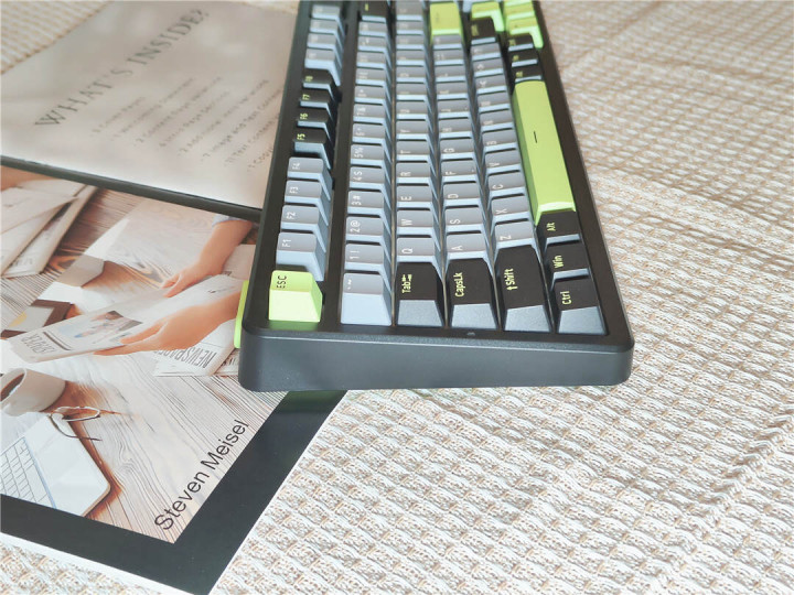 键帽是 OEM 高度的高含量 PBT 材质,磨砂手感很细腻,不像 ABS 键帽那样容易沾指纹、用久了打油 —— 我每天用 4 小时以上,用了两个月,键帽上还是干干净净的,一点油腻感都没有。机身侧面是微弧设计,边缘不割手,偶尔单手拎键盘也舒服。