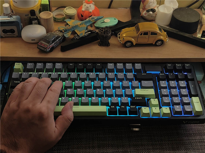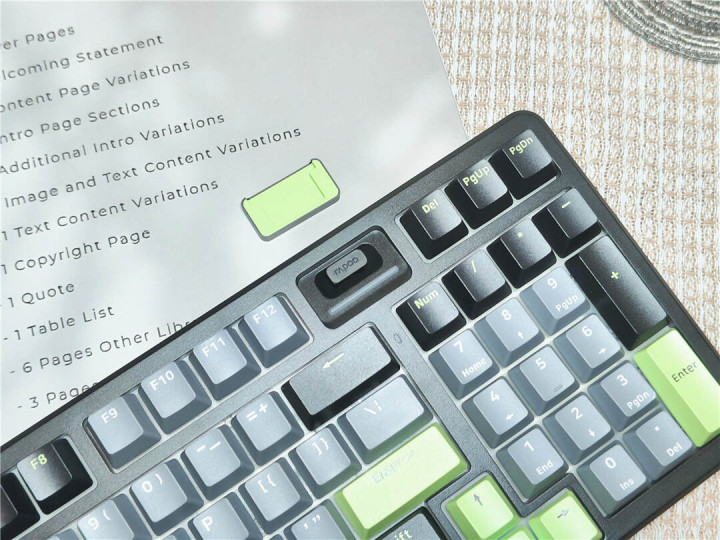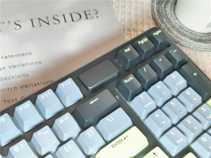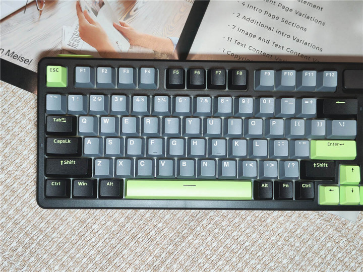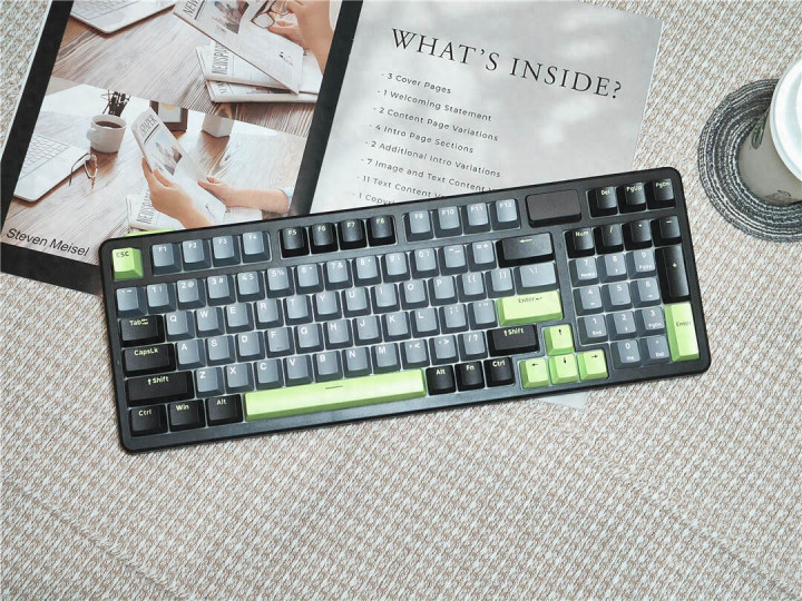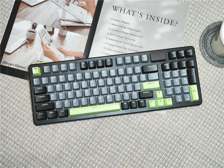 我选的是黑灰绿色款,键盘是 97键 “时空幻境仓” 布局,比全尺寸键盘省空间,又比 87 键多了数字小键盘,码报表、输密码时不用再凑屏幕键盘,对办公党太友好。