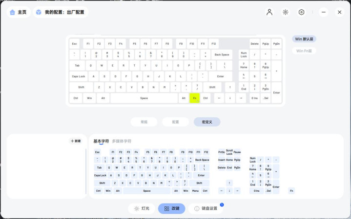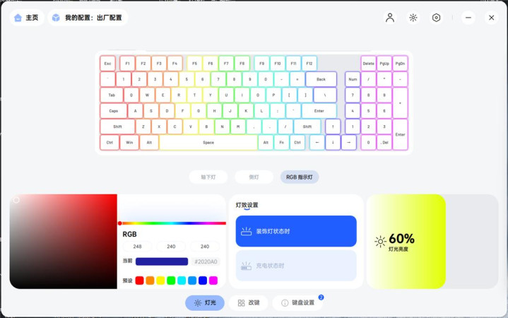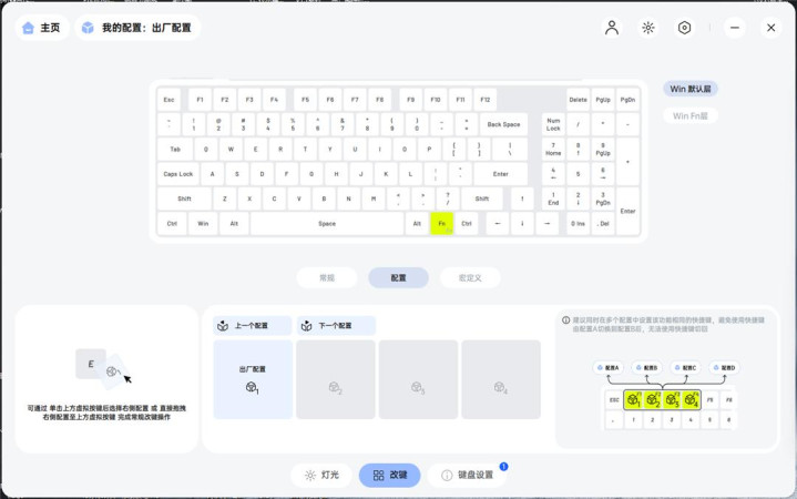 我最常用的是 “灯光设置”:键盘的 “时空幻境仓” 区域可以自定义颜色,还有呼吸、流光、常亮等多种预设按键背光模式,亮度能调,晚上用最低亮度也不刺眼。我把办公模式设为暖黄色常亮,游戏模式设为流光蓝,切换配置文件时灯光会自动跟着变,很有仪式感。
