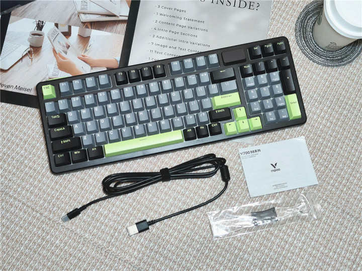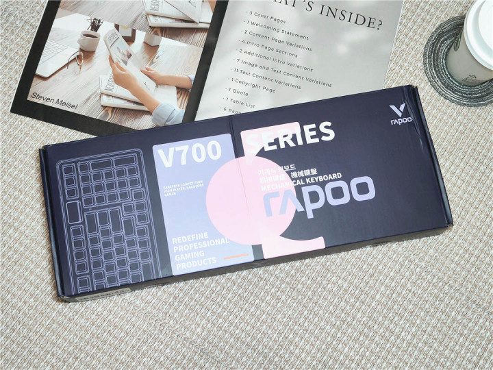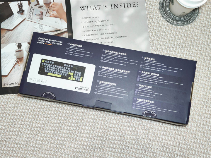 雷柏 V700 DIY-98 的外包装延续了品牌一贯的简约风格,以沉稳的深色调为主,正面清晰印着 “V700 DIY-98” 产品名称与机械键盘的示意图,让用户一眼就能知晓产品身份。包装盒背面还标注了 “全键热插拔” 等核心卖点,这样无需拆开包装,我就能快速判断产品是否符合自身需求。